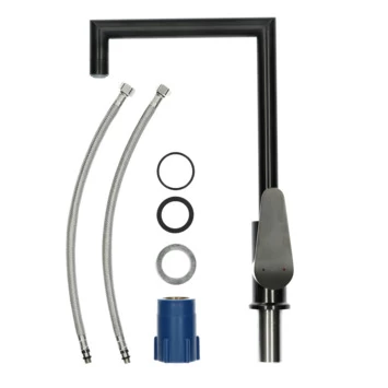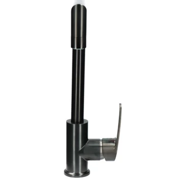 De Absolut keukenkraan Fasso met hendel Grafiet is een blikvanger in je keuken met de hoge hoekige U-vormige uitloop. De strakke vormgeving en grafietkleurige afwerking passen perfect in jouw landelijke of industriële keuken. De kraan kun je ook verkrijgen in zwart of chroom. Met de kraan ga je ook in de tijd mee door de ingebouwde waterbespaarder in de sproeikop. Zo bespaar je op je waterverbruik. Dat is niet alleen goed voor het milieu, maar ook voor je portemonnee. De hoogte van maar liefst 48 cm in combinatie met de 360° draaibaarheid van de uitloop zorgen dat je veel ruimte in je gootsteen hebt. Handig als je een grote pan moet vullen! Met de eenhendelbediening meng je eenvoudig met 1 hand het water naar de gewenste temperatuur. De keramische schijven maken draaien soepel en nauwkeurig en vergen bovendien weinig onderhoud. Ook veeg je kalk eenvoudig met je vingers van de uitloop af doordat vuil en kalk zich niet makkelijk hecht aan de siliconen noppen in de sproeikop. Met de meegeleverde flexibele aansluitslangen en bevestigingsmateriaal sluit je deze kraan eenvoudig zelf aan. Op de kraan krijg je 5 jaar garantie.