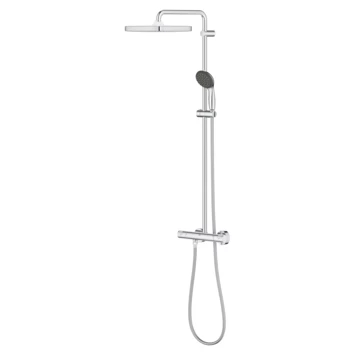 Met het Grohe Vitalio Start douchesysteem ga je voor een douchesysteem met geweldige functies en een royalere dekking voor een eenvoudige upgrade van je huidige badkamer. Dit GROHE Vitalio Start 250 Cube thermostatische douchesysteem biedt je dit allemaal, plus alle voordelen qua gemak en comfort van een thermostaat. Dit opbouwsysteem om aan de wand te monteren bestaat uit een Vitalio Comfort 250 Cube hoofddouche, een Vitalio Start 100 handdouche, thermostaat, douchestang met 390mm zwenkbare douchearm en glij-element om de handdouche te verstellen, plus een 1750mm VitalioFlex Comfort Twistfree doucheslang. De hoofddouche van 250mm biedt een zachte, ontspannende Rain Spray. De 100mm handdouche wordt geleverd met een ShockProof siliconen ring om hem te beschermen tegen vallen of stoten. GROHE DreamSpray zorgt ervoor dat de straal uit elk sproeigaatje precies goed is waardoor je douche-ervaring nog meer comfort en plezier biedt. De SpeedClean-sproeigaatjes zijn ontworpen om kalk er makkelijk vanaf te vegen. Het douchesysteem levert water met een constante temperatuur zodat je nooit voor onaangename verrassingen komt te staan dankzij GROHE’s TurboStat-technologie. Om je te beschermen tegen verbranding is de GROHE SafeStop temperatuurbegrenzer ingesteld op 38°C. Hiermee wordt er voorkomen dat met name kinderen de watertemperatuur per ongeluk te hoog zetten. En de GROHE SafeStop Plus-temperatuurbegrenzer kan worden ingesteld op 43°C voor extra veiligheid. Schakel tussen hoofd- en handdouche en regel het volume, allemaal via één handgreep dankzij de AquaDimmer-functie. De duurzame maar oogverblindende GROHE StarLight chroomn afwerking zorgt ervoor dat het douchesysteem er jarenlang onberispelijk uit blijft zien.Â