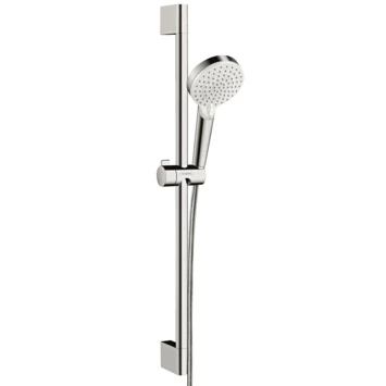 De Hansgrohe Doucheset Crometta Vario met Glijstang 2 Douchestanden bestaat uit een handdouche met 2 straalstanden, een douchestang van 65 cm met verstelbare handdouchehouder en 1 doucheslang. De XXL douchekop met 10 mm doorsnede biedt groots doucheplezier. Door aan de straalschijf te draaien kan je tussen 2 straalsoorten wisselen: een krachtige regenstraal of een ontspannende IntenseRain straal. De handdouchehouder kun je traploos verstellen voor meer gebruiksgemak. Dankzij de QuickClean anti-kalkfunctie wrijf je kalk en vuil eenvoudig met de hand of een doek van de siliconen noppen van de douchekop weg. Hierdoor blijft de straal langer vol en gaat hij zeker nog jaren mee. Op de doucheset zit 5 jaar garantie.