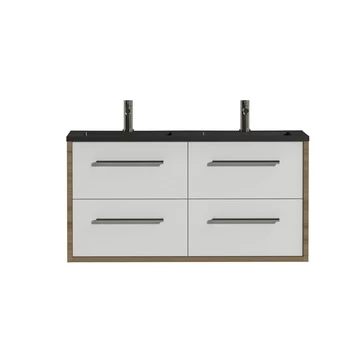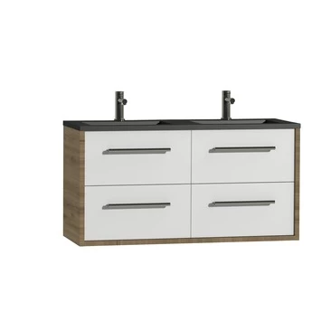 Het Tiger Boston badkamermeubel is krachtig en elegant tegelijk en de mooie ronde greep ligt aangenaam in de hand. De 4 lades bieden voldoende ruimte om alle badkamerartikelen overzichtelijk in op te bergen. Daarnaast zijn ze uitgerust met hoogwaardige ‘soft close’ geleiders waardoor ze geruisloos sluiten. De warme houttint geeft een sfeervol karakter aan het meubel. Daarnaast krijgt het meubel, door de voelbare houtnerf, een mooie natuurlijke uitstraling. De strakke, mat zwarte polybeton wastafel met imitatie natuursteen look maakt deze set compleet.