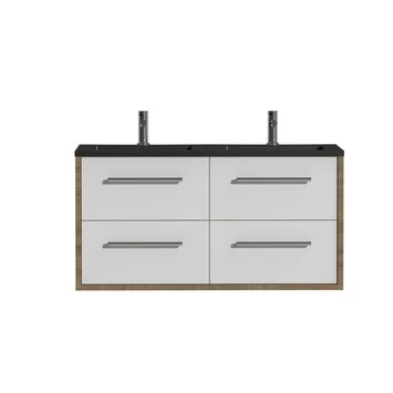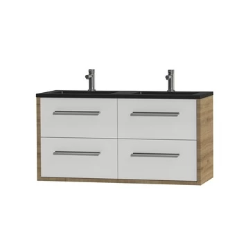 Het Tiger Boston badkamermeubel is krachtig en elegant tegelijk en de mooie ronde greep ligt aangenaam in de hand. De 4 lades bieden voldoende ruimte om alle badkamerartikelen overzichtelijk in op te bergen. Daarnaast zijn ze uitgerust met hoogwaardige ‘soft close’ geleiders waardoor ze geruisloos sluiten. De warme houttint geeft een sfeervol karakter aan het meubel. Daarnaast krijgt het meubel, door de voelbare houtnerf, een mooie natuurlijke uitstraling. De strakke, mat zwarte polybeton wastafel met imitatie natuursteen look maakt deze set compleet.