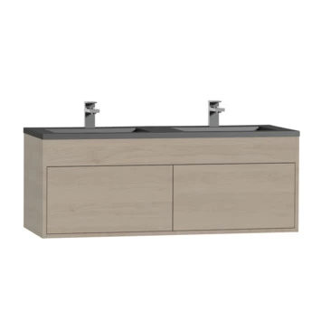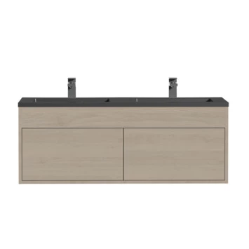 Het Tiger Helsinki badkamermeubel is een simplistisch, modern en greeploos meubel in Scandinavisch design. De wastafelonderkast is voorzien ruime lades waarin alle badkamerspullen overzichtelijk opgeborgen kunnen worden. Voor extra comfort is deze onderkast voorzien van handige ‘push to open’ lades waardoor ze al middels één simpele aanraking openen. De warme houttint geeft een sfeervol karakter aan het meubel. Daarnaast krijgt het meubel, door de voelbare houtnerf, een mooie natuurlijke uitstraling. De stakke, mat zwarte polybeton wastafel met immitatie natuursteen look maakt deze set compleet.