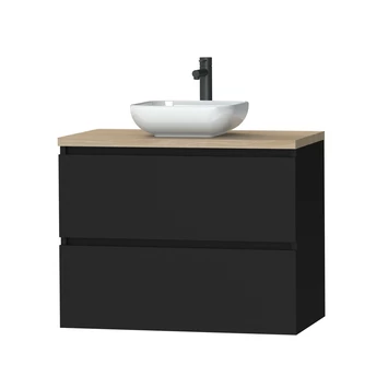 Het Tiger Karlo badkamermeubel 80cm Mat Zwart met eiken wasblad en keramische waskom is krachtig en elegant tegelijk.  De 2 lades bieden voldoende ruimte om alle badkamerartikelen overzichtelijk in op te bergen. Daarnaast zijn ze uitgerust met hoogwaardige ‘soft close’ geleiders waardoor ze geruisloos sluiten. De mat zwarte kleur geeft een sfeervol karakter aan het meubel. Het licht eiken wasblad met de keramische kom geven dit meubel een stoere afwerking.Â