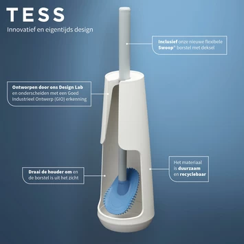 Een fris en modern gevoel in toilet of badkamer dankzij de witte wc-borstelhouder van Tiger Tess. Deze vrijstaande houder is voorzien van de nieuwe Swoop® flexibele toiletborstel. Met deze innovatieve borstelkop reinig je met gemak moeilijk bereikbare plekken en dankzij de vorm en het speciale materiaal van de borstel blijft er geen viezigheid achter en druppelt hij nauwelijks na als je hem terug in de houder plaatst. Draai de houder om en de borstel is niet langer meer in het zicht. Tiger Tess is innovatief en eigentijds met de herkenbare kwaliteit van Tiger.